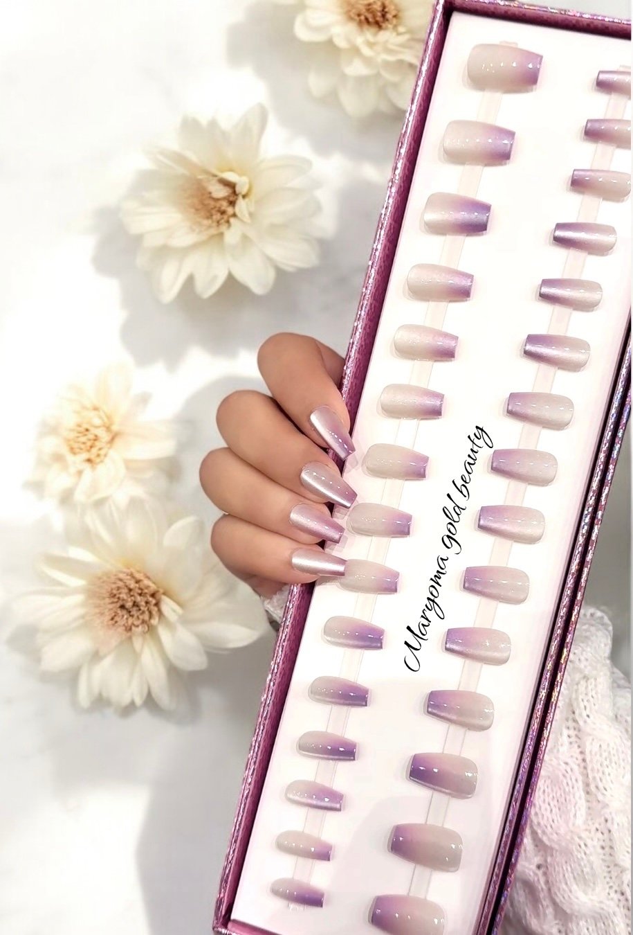 أظافر بتأثير Cat Eyes اللامع وتدرج بنفسجي ساحر يمنحكِ لمعة فريدة تتغيّر مع الإضاءة. تصميم أنثوي ناعم يضفي لمسة فخامة راقية على إطلالتك، سواء في المناسبات أو الأيام العادية. خفيفة، سهلة التركيب، وتدوم بثبات.