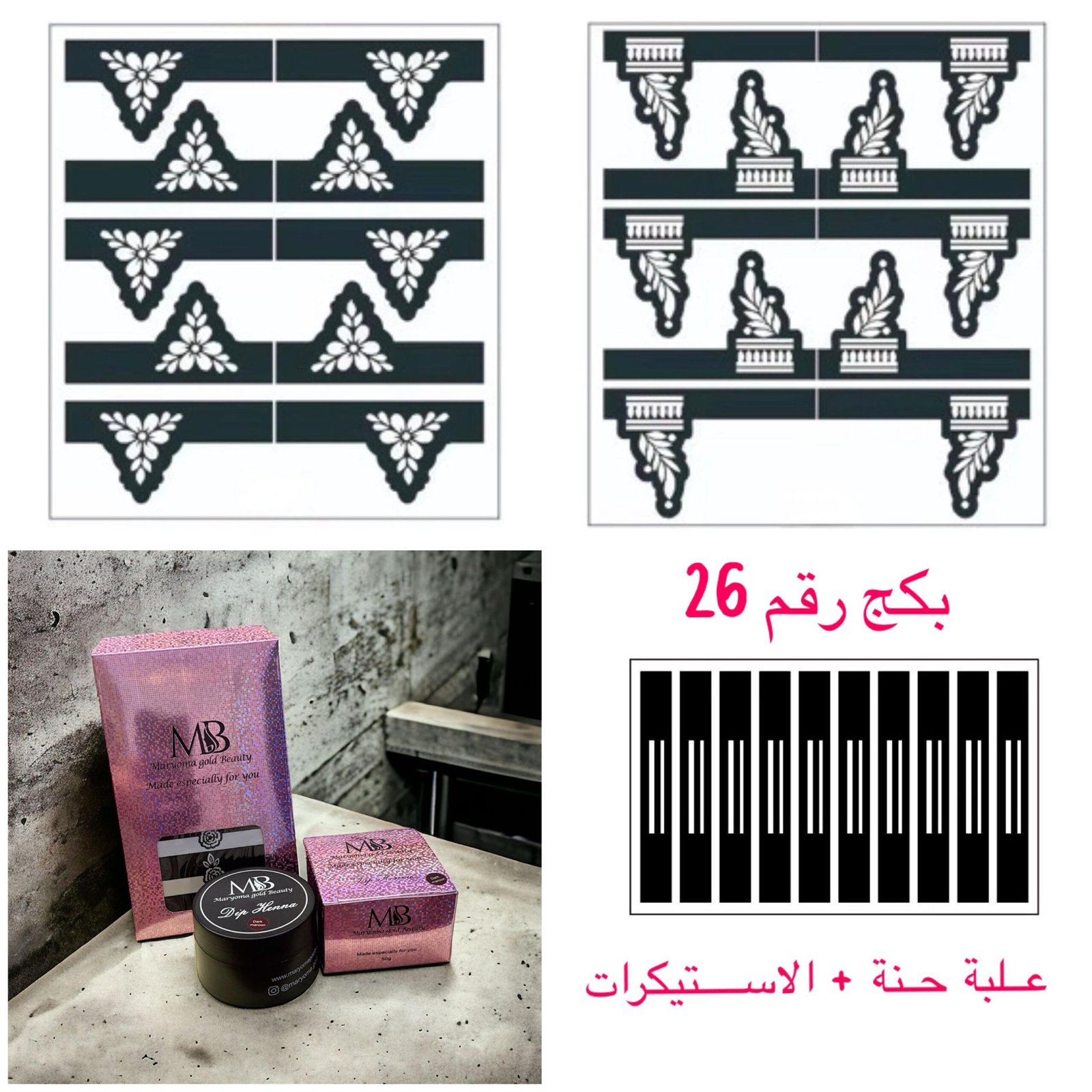 الاستيكرات المرفقة تساعدك على تحديد شكل الحنة بدقة للحصول على نتيجة نظيفة ومتناسقة حتى لو كانت هذه أول مرة لكِ.